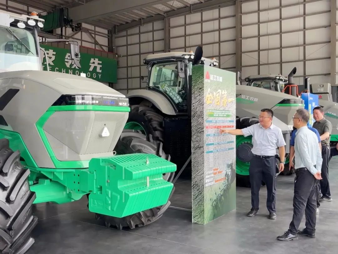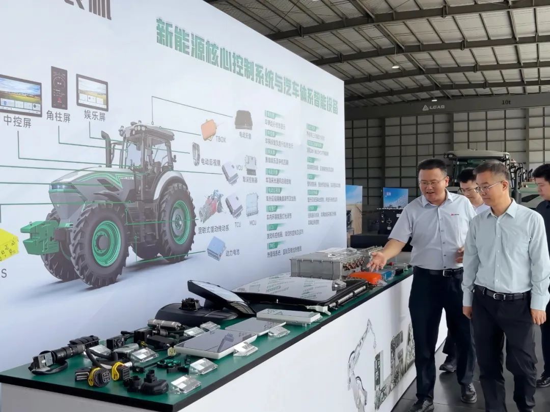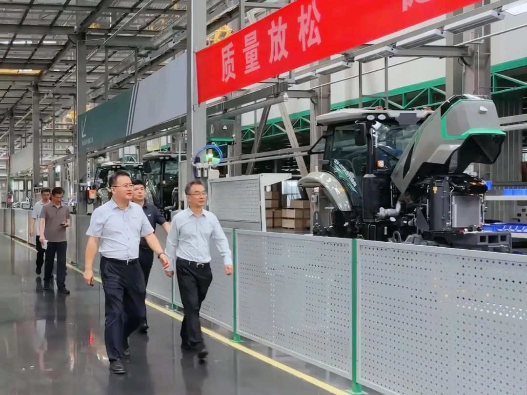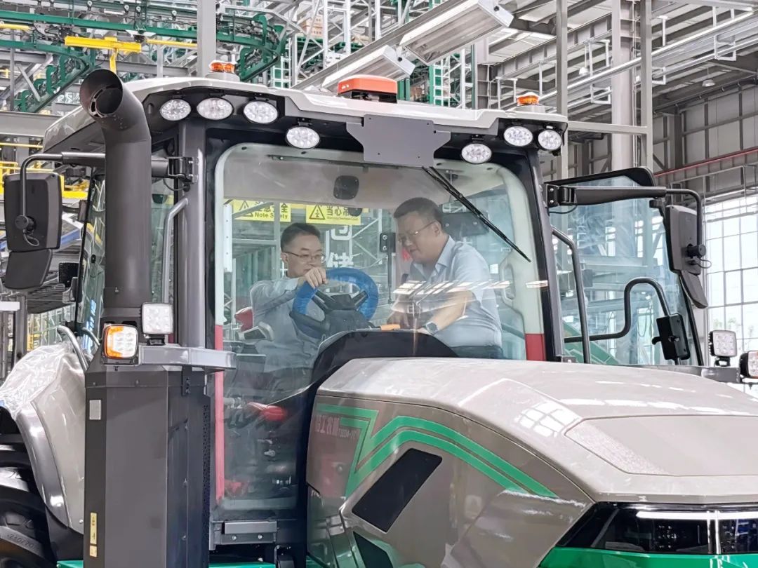 调研组一行深入智能工厂实地调研,视察新能源及燃油拖拉机总装线、发动机及底盘分装线等智能化自动生产线,重点了解80-600马力全系列拖拉机及收获机在产品布局、市场规划和推广服务等方面的进展情况,近距离观察感受产品的设计细节,并亲自上车体验新能源拖拉机操纵的便捷性。